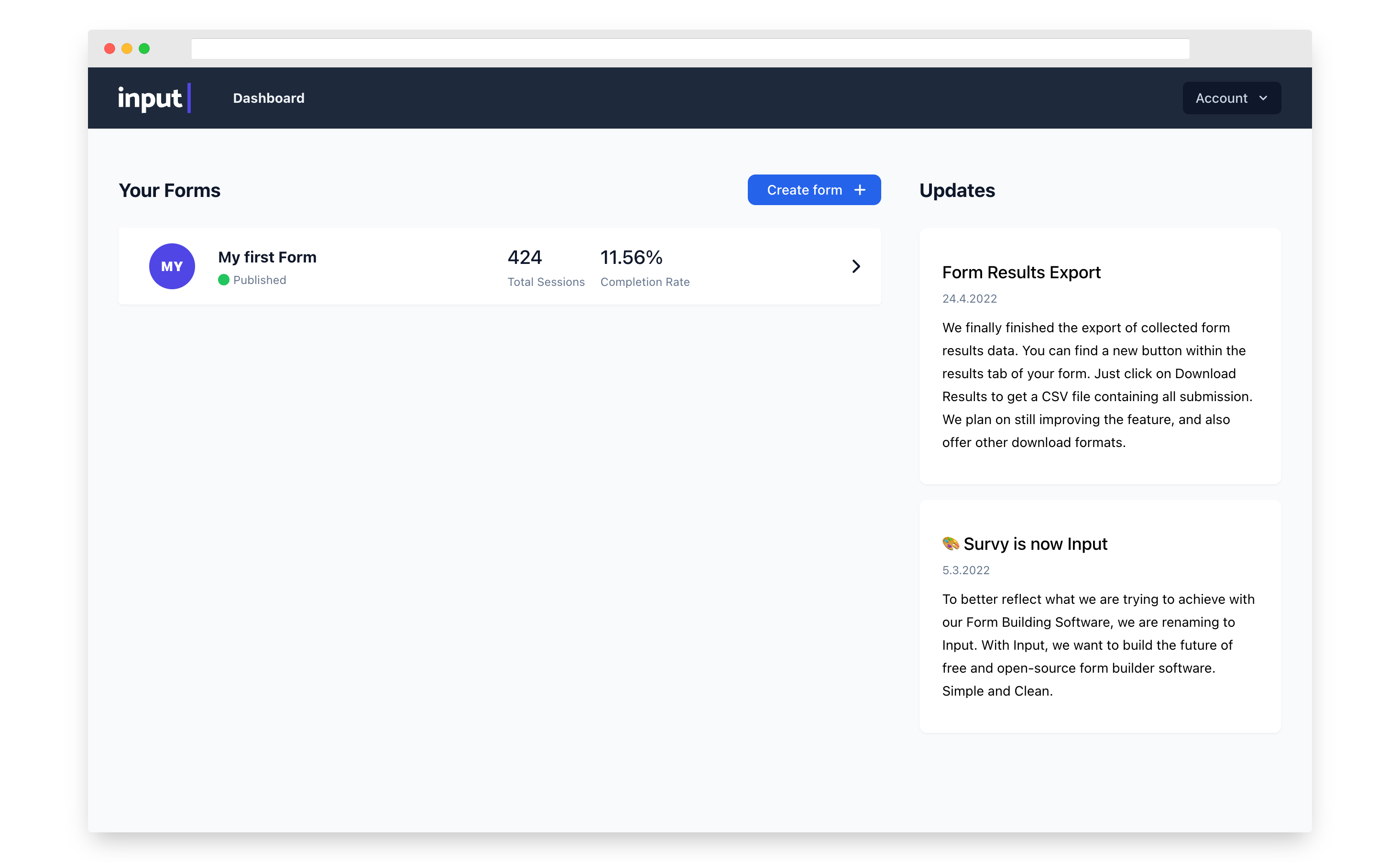 To create a new form, go to the Dashboard View. There you see all your previously created forms in a list view. To the top right of this list, you find a button labeled “Create form”.