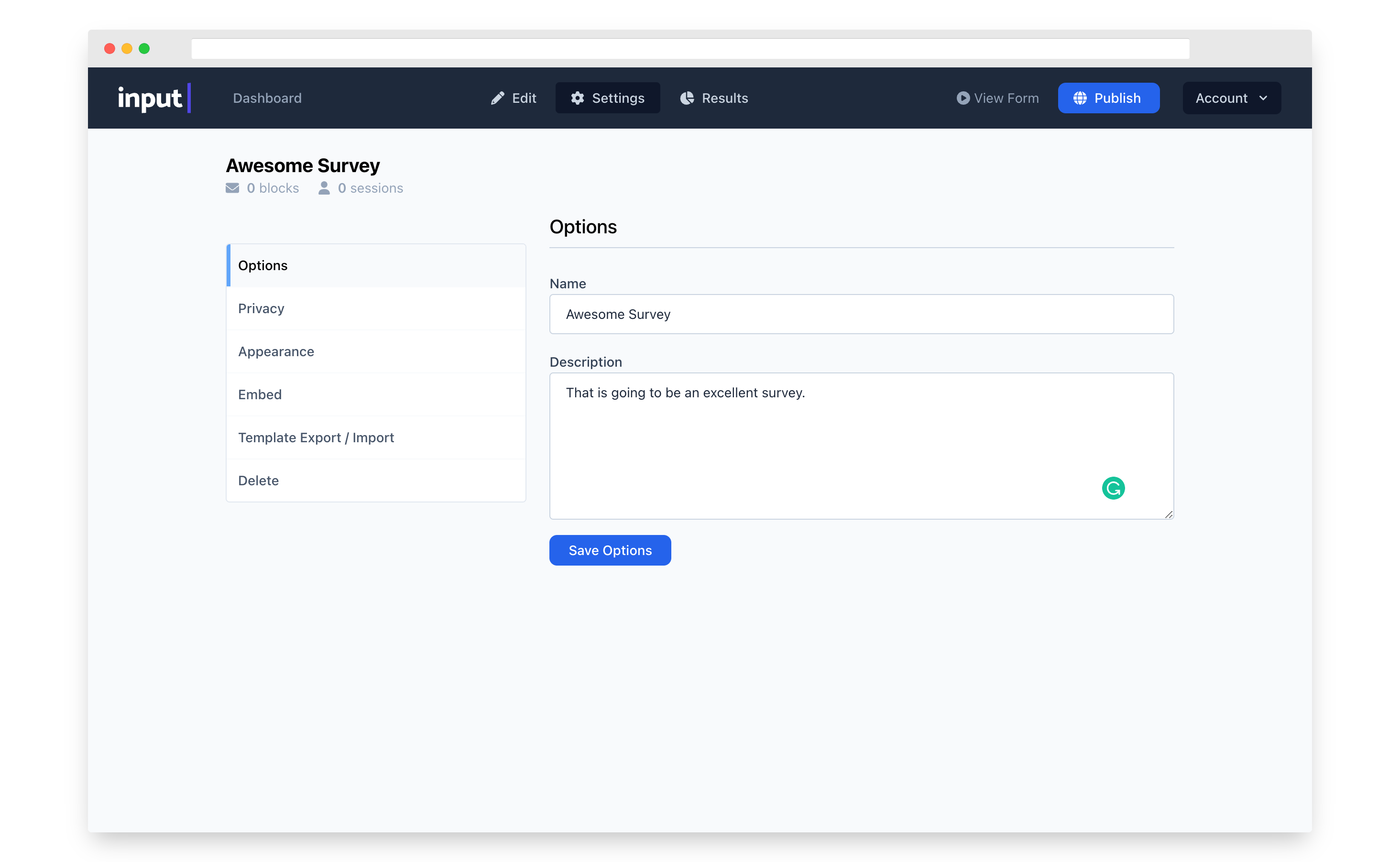 To be able to find your form later on, and also to make it more relatable to your form users, you can give your form a name and a description. To do that, click on Settings on the top bar navigation and make sure that Options is selected on the Sidebar navigation. There you can fill out both the name and description and click on the "Save Options” button to permanently store it.