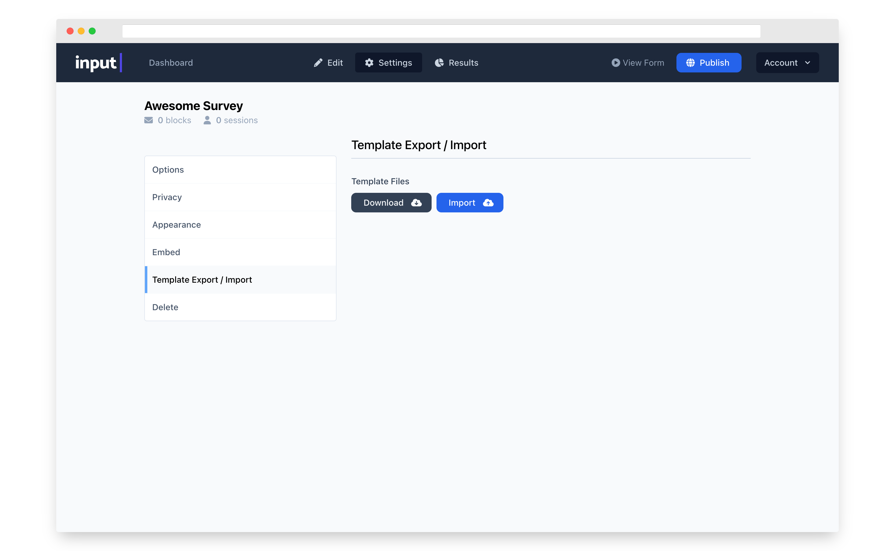 In Input, you can export and import your entire form’s settings and blocks to a file. This allows for several use cases, like: